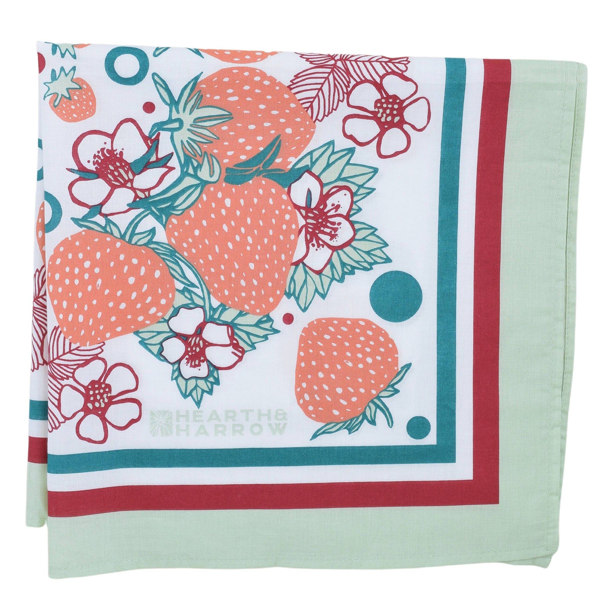 Strawberry sweetness meets vintage charm in this 22" x 22" cotton bandana! Hand screen-printed with eco-friendly inks by artisans in India and designed in Rockport, Maine, it's ready for anything—tie it on, tie it up, or tie it to your pup. Soft, comfy, and endlessly versatile, this playful patch of joy works as a headscarf, hiking companion, outfit accent, or luggage tag. Pure fun in fabric form.