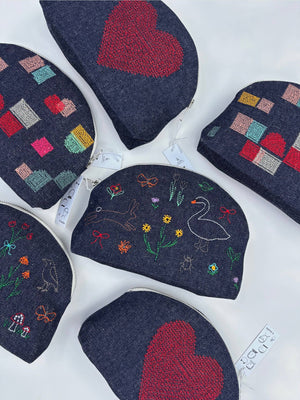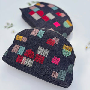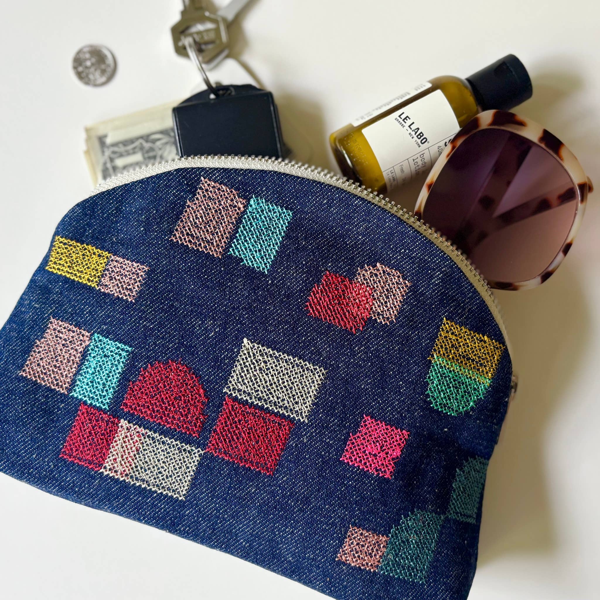 Little squares in all your favorite colors are cross stitched onto this sweet denim pouch, making it as fun to look at as it is practical to use. Whether you're stashing sunglasses, your phone, lipgloss, or a mix of essentials, this versatile pouch keeps everything organized in style. The front and back feature vibrant multicolor stitching that adds personality to your everyday carry. Crafted from durable denim with a smooth ecru and silver metal zipper, it's built to handle whatever you throw at it. At 5.5" tall by 8.5" wide, it's the perfect size for your pocket, bag, or desk drawer. A little pop of color for all your little things.