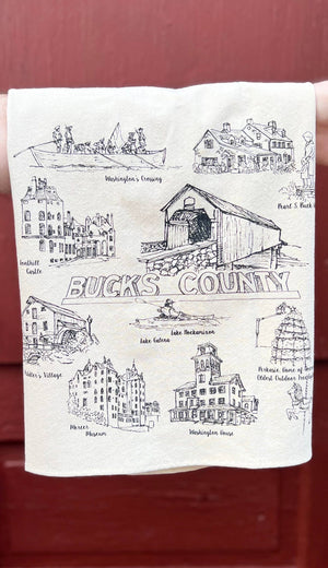 Introducing our NEW Bucks County, PA Tea Towel! We love our area of Pennsylvania, and our in house artist sketched some of the very special places that are near and dear to us! Comes packaged in a beautiful kraft band, ready to sell! Screen printed and sewn in Bucks County, PA. Minimum order for this item is 10 per design. 100% pre-shrunk, flour sack cotton. Tea towel measures approximately 26" x 26". Machine wash delicate with like colors. Do not bleach. Tumble dry low.