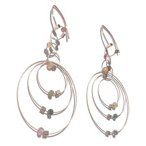 Long and elegant, the Exclamation earrings are the perfect punctuation for any fashion statement. Flexible, light woven stainless steel mini cable finished with nylon for a smooth feel. Each piece is hand-finished with little accents of 14k gold-filled as well as semi-precious stones.