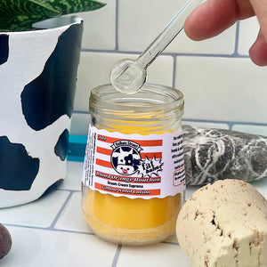 As always, made with the best dang skin-loving, grass-fed, local tallow we could find, and local, unadulterated beeswax tallow, jojoba, beeswax, essential oils (lemon, ginger), vanilla absolute, lemon peel, calendula, oats, turmeric