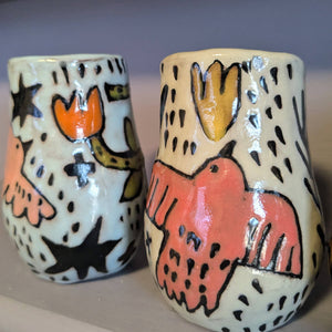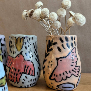 Add a splash of charm to your space with the Pink Birds Mini Vase! Handmade from kiln-fired terra cotta clay, each vase is carefully crafted and glazed by hand, making every piece uniquely special. The delightful hand-drawn pink bird designs bring a touch of whimsy and nature indoors. Perfect for small blooms or as a cheerful decorative accent, this mini vase brightens any room with its playful character and artistic charm. Embrace the joy of owning a one-of-a-kind creation that's as fun as it is functional!