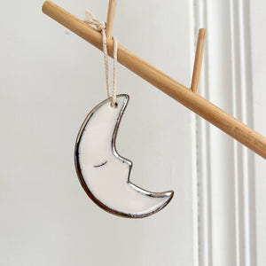 A peaceful, sleeping moon for your tree. This gentle moon is handmade in porcelain and has hand drawn details with real silver lustre dancing along it's outline making it a beautiful gift or stocking stuffer!