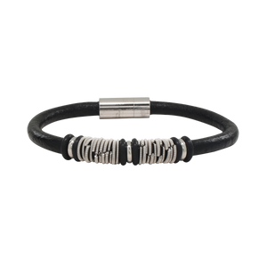 Electric guitar string circlets, stainless steel beads and silicone spacer beads are stacked on thick black leather and finished with a stainless steel magnet clasp.