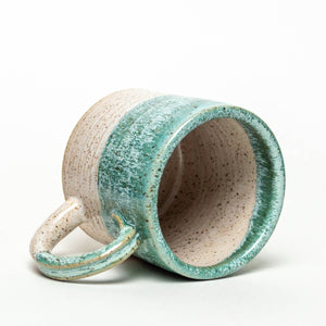 This beautiful hand-thrown turquoise and white stoneware ceramic mug, approximately 12-14 oz., is hand-thrown and hand-glazed in Oberlin, OH, USA.