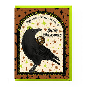 Celebrate lovers of shiny things and strange birds with this beanie-clad crow and its favorite find. Printed on 100% recycled paper and paired with a coordinating envelope. Blank inside and sealed in a protective cellophane sleeve. Size A2 (4.25" x 5.5"). Card reads "May your birthday be filled with shiny treasures" and features an illustrated crow wearing a beanie holding a gold disco ball, surrounded by stars.