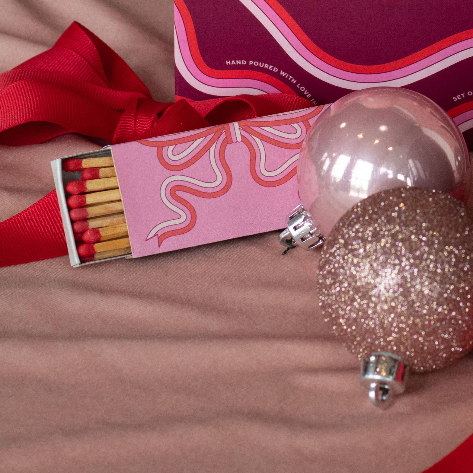 Add a touch of festive fun to your candle lighting with the Pink Holidays with a Bow 3" Matchbox! These charming little matchboxes feature a delightful pink and red bow design that instantly brightens any gift or cozy night in. Each box holds about 17 red-tipped safety strike matches, perfect for sparking up candles, fireplaces, or holiday magic. The convenient sliding tray keeps your matches secure and ready for action, while the individual shrink-wrap ensures freshness and a polished look. Whether you're sending a thoughtful gift or treating yourself, these playful matches add that extra sprinkle of cheer and style to every flame you light.
