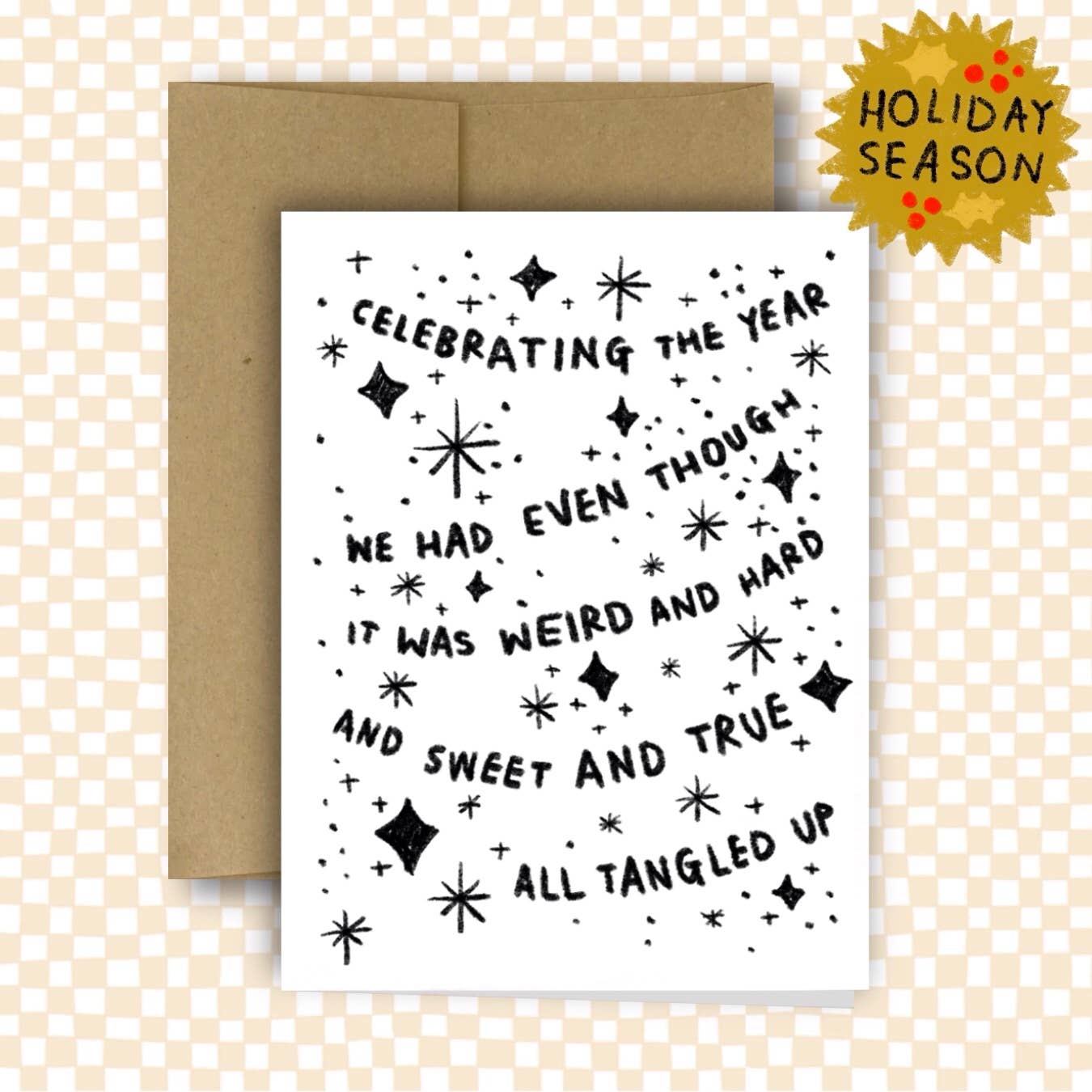Celebrate the beautiful mess of the past year with this honest and heartfelt holiday card. Featuring the message "CELEBRATING THE YEAR WE HAD EVEN THOUGH IT WAS WEIRD AND HARD AND SWEET AND TRUE ALL TANGLED UP" in charming hand-written lettering, surrounded by playful stars and confetti, this card perfectly captures the complexity of shared experiences and genuine connection. Each card arrives nestled in a protective cello sleeve, ready to brighten someone's holiday season. The blank interior invites you to add your own reflections and memories from the year you've shared. Printed on gorgeous matte 100LB vellum cardstock (4 1/4" x 5 1/2"), the card feels substantial and elegant in hand. It comes with a beautifully textured 30% recycled kraft envelope (4 3/8" x 5 3/4"), adding an eco-friendly touch to your heartfelt gesture. Proudly made in the USA and printed in Red Hook, New York, this card is crafted using our artisanal small batch production method, ensuring quality and authenticity in every detail. Due to our hands-on approach, you may notice charming color variations from card to card, reflecting the genuine, handmade character of your message. A meaningful