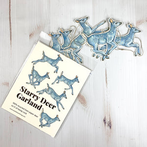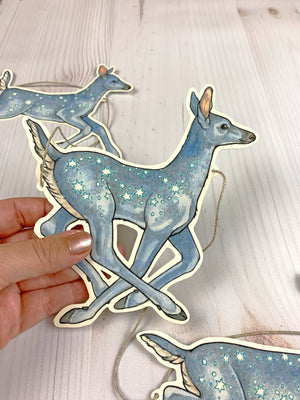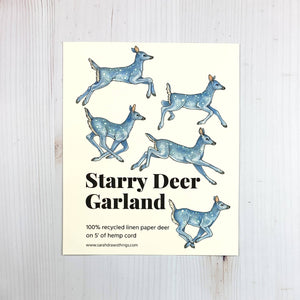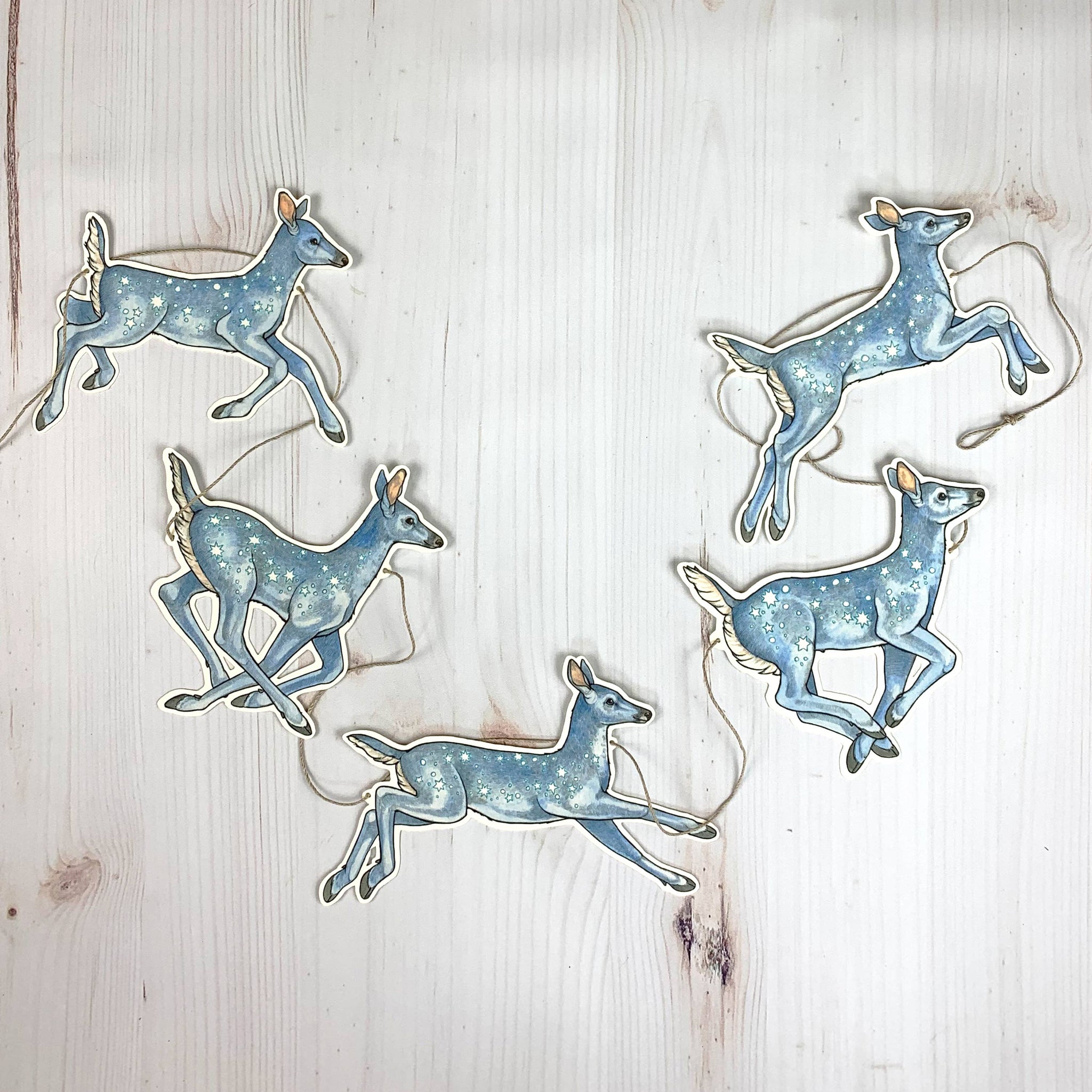 This enchanting 5-foot garland brings a touch of whimsy to any space with its charming watercolor and pencil illustrations. Featuring five adorable blue white-tailed deer fawns adorned with twinkling starry spots, each deer measures approximately 6 inches wide and is lovingly printed on 100% recycled linen paper. The garland is strung together with eco-friendly hemp cord, making it as kind to the planet as it is delightful to display. Perfect for nurseries, bedrooms, or festive celebrations, this one-of-a-kind piece combines artistic charm with environmental consciousness. Comes thoughtfully packaged in a compostable plant-based sleeve with an 8x10-inch white backing board, ready to inspire wonder and imagination.