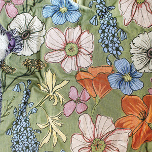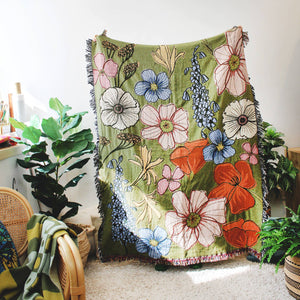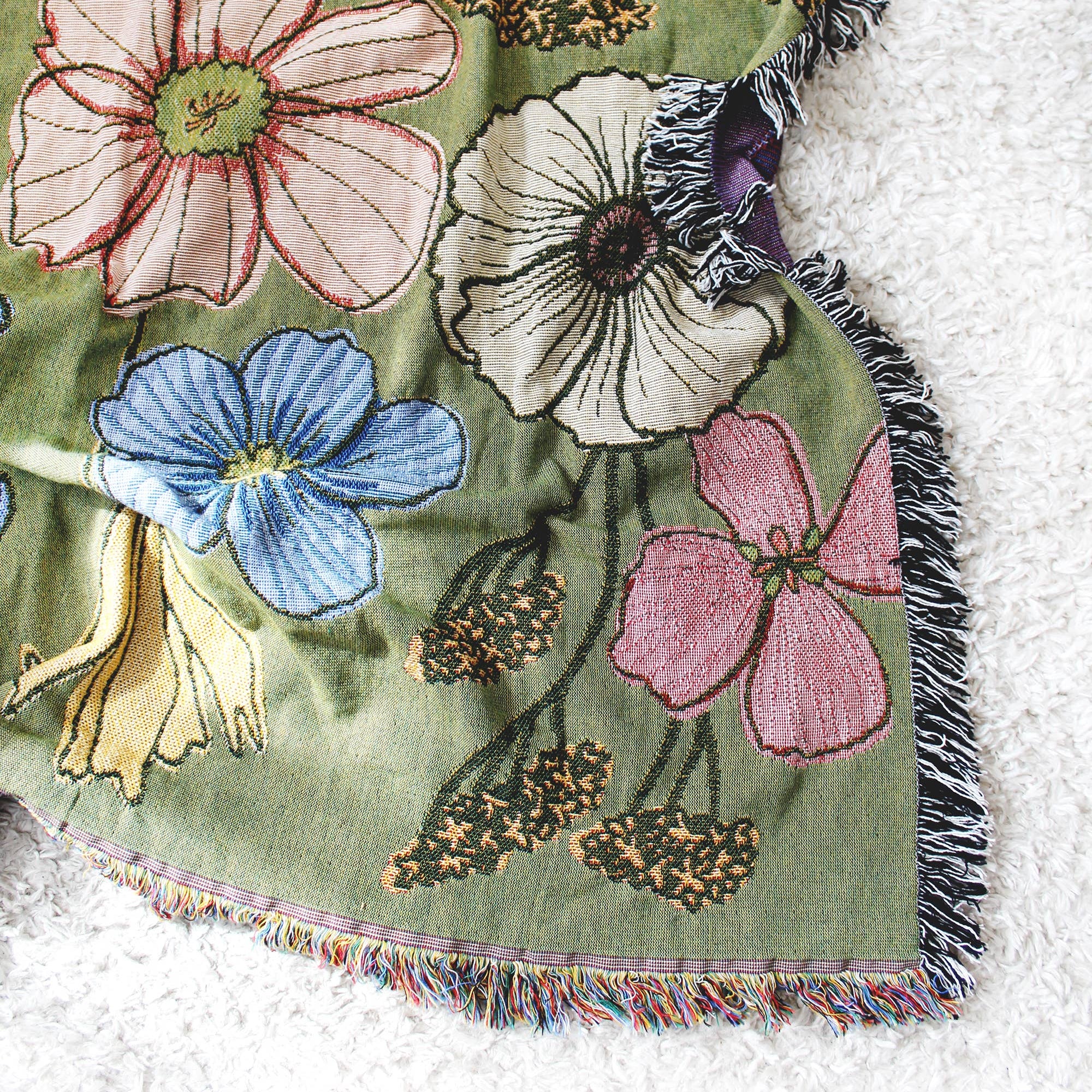 Wrap yourself in nature's wildest palette! This tapestry blanket bursts with vibrant, delicate florals dancing across a soothing olive green backdrop. Perfect for cozying up or adding a pop of botanical charm to any space. At 50"x 68", it's generously sized for maximum snuggle potential. Crafted from 94% recycled cotton and 6% acrylic, it's as kind to the planet as it is soft on your skin. Machine wash cold, tumble dry low for easy care. Designed in Brooklyn, proudly made in the U.S.A.