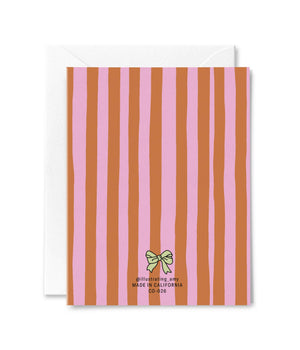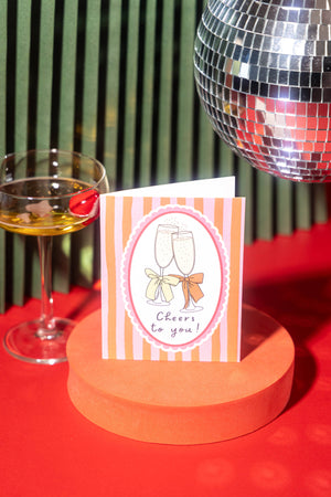 Raise a glass and celebrate life’s happiest moments with this playful champagne card. Featuring two clinking glasses tied up with colorful bows and surrounded by a bold striped border, it’s the perfect way to toast birthdays, engagements, anniversaries, or any special occasion worth celebrating. Blank inside for your personalized message, it comes with a matching envelope and is printed on high-quality card stock. • Size: A2 (4.25 x 5.5 inch) • Blank inside so you can write your own personal message • Comes with matching envelope and protective cellophane sleeve • Perfectly imperfect—if you spot a speckle or two, it's all part of the charm of our 100% recycled paper • Made in the California