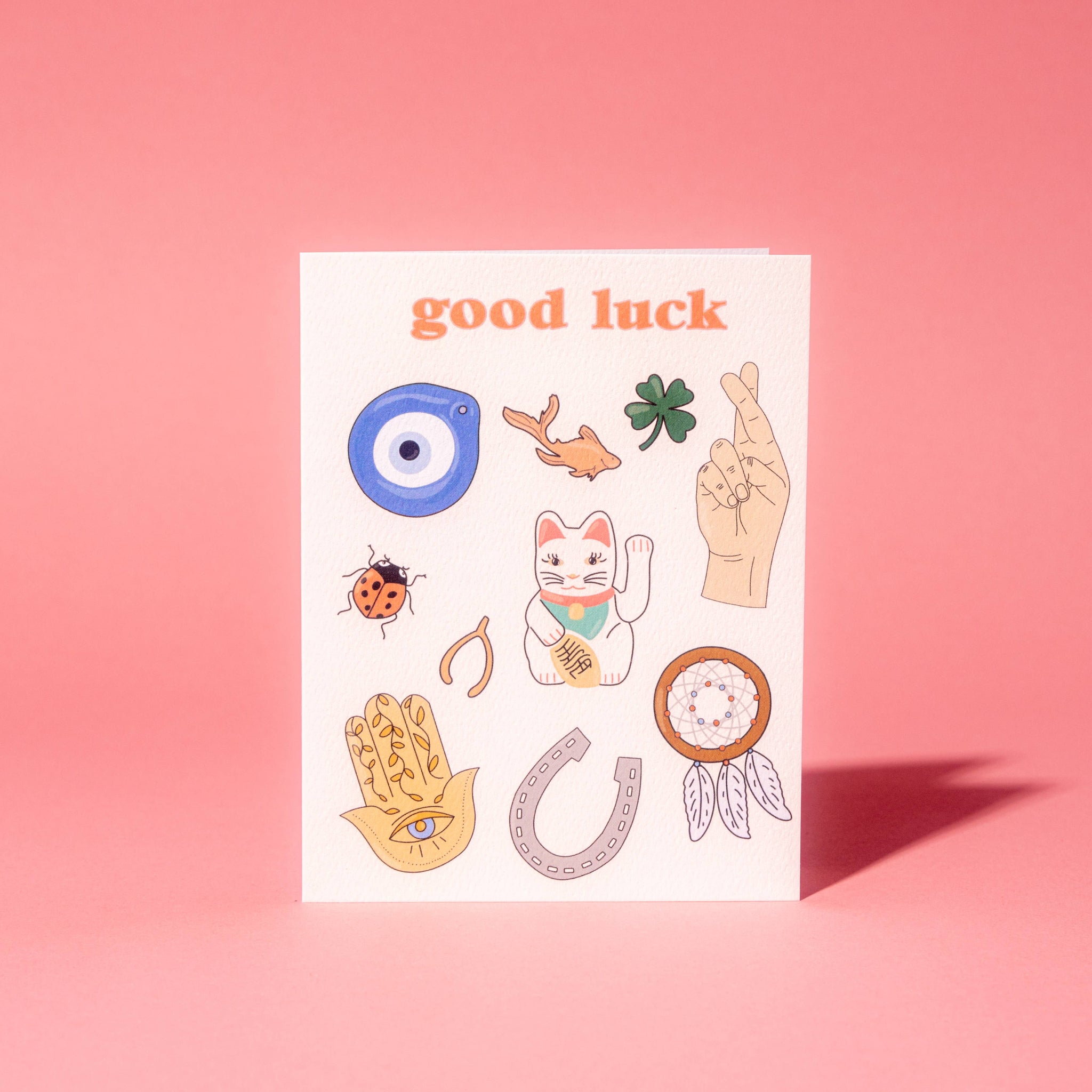 No matter what your lucky charm is, our Good Luck Charms card has it all. With a delightful collection of illustrations showcasing various symbols of good luck, from ladybugs to the evil eye and shamrock, this card is a charming way to wish someone all the luck in the world and remind them that they are surrounded by positive vibes.