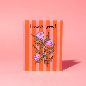 Express Gratitude in Full Bloom! Our Thank You greeting card, with a vibrant red and pink striped background and adorned with charming purple flowers and lush green leaves, is a blooming testament to your heartfelt appreciation. Say 'Thank You' with a touch of elegance and a burst of color.
