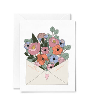 Send a heartfelt message with our 'With Love' card. Featuring a delightful illustration of vibrant flowers bursting out of an envelope, this card is a charming way to express your affection and deliver a little dose of love to someone special.
