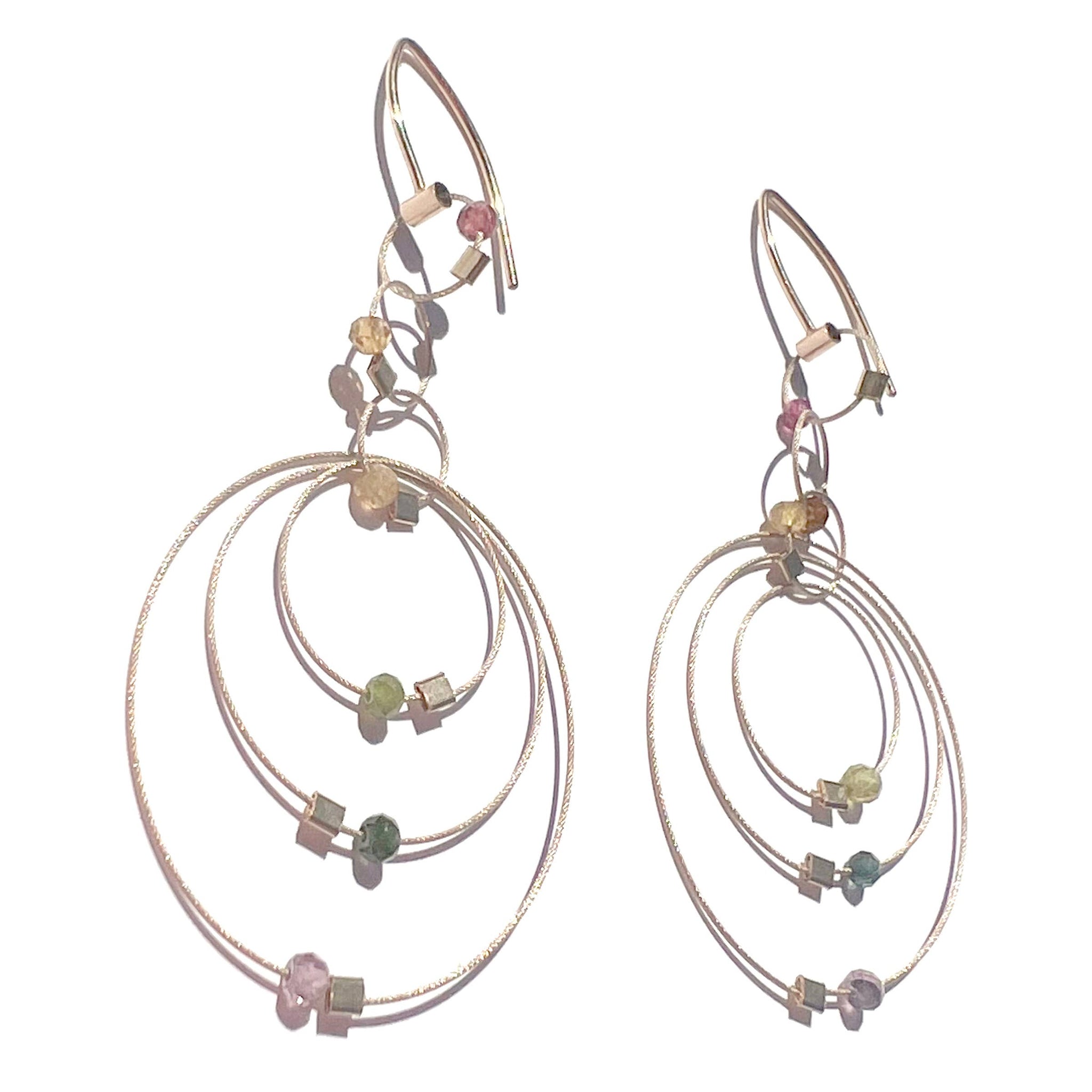 Long and elegant, the Exclamation earrings are the perfect punctuation for any fashion statement. Flexible, light woven stainless steel mini cable finished with nylon for a smooth feel. Each piece is hand-finished with little accents of 14k gold-filled as well as semi-precious stones.
