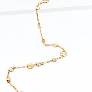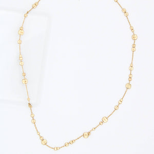 This is one of our favorite necklaces—and honestly, we can't blame ourselves. The crushed gold beads catch the light like tiny fireworks, giving you that coveted glitter-and-glamour vibe without the mess. Wear it solo for understated sparkle or layer it with other pieces for maximum shine. At 18 inches, it hits that sweet spot between delicate and statement-making. Chain, beads, and clasp are all 14k gold filled, so your neck gets the luxury treatment it deserves.