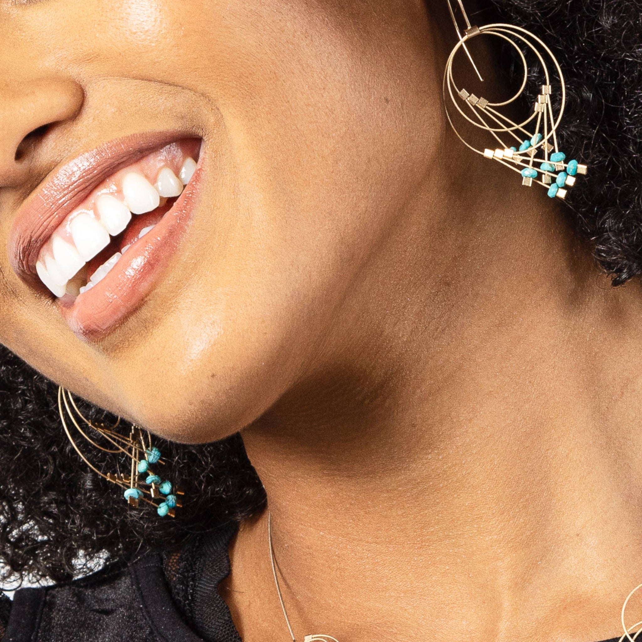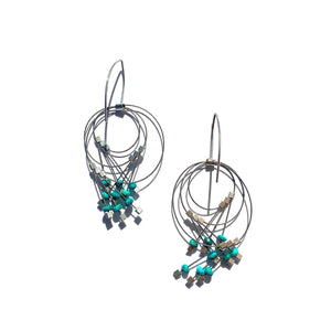 Make a bold statement with these turquoise vertigo hook earrings—a fun, exaggerated twist on the timeless chandelier style. Crafted from flexible, lightweight woven stainless steel cable wrapped in smooth nylon, they're surprisingly comfortable for all-day wear. Delicate 14k gold-fill accents and your choice of stone finish add sophistication to the playful design. At 1.75" long with hypoallergenic gold-fill hooks, these travel-friendly earrings bounce back to shape even after being packed away. Durable, distinctive, and ready for adventure.