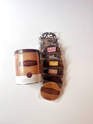 This elegant collector’s tin not only keeps your Stroopwafels fresh with its airtight seal but also makes a charming display piece for your kitchen or office. Inside, you’ll find eight delicious Stroopies—one of each delightful flavor: classic Traditional, rich Chocolate, buttery Salted Caramel, bold Espresso, crunchy Pecan, tropical Coconut, festive Peppermint, and gooey Marshmallow. The perfect way to explore all our tasty varieties or share a tasty surprise with friends and family. Whether for yourself or a gift, this playful assortment brings a world of sweet, chewy joy in one gorgeous package!
