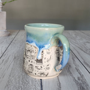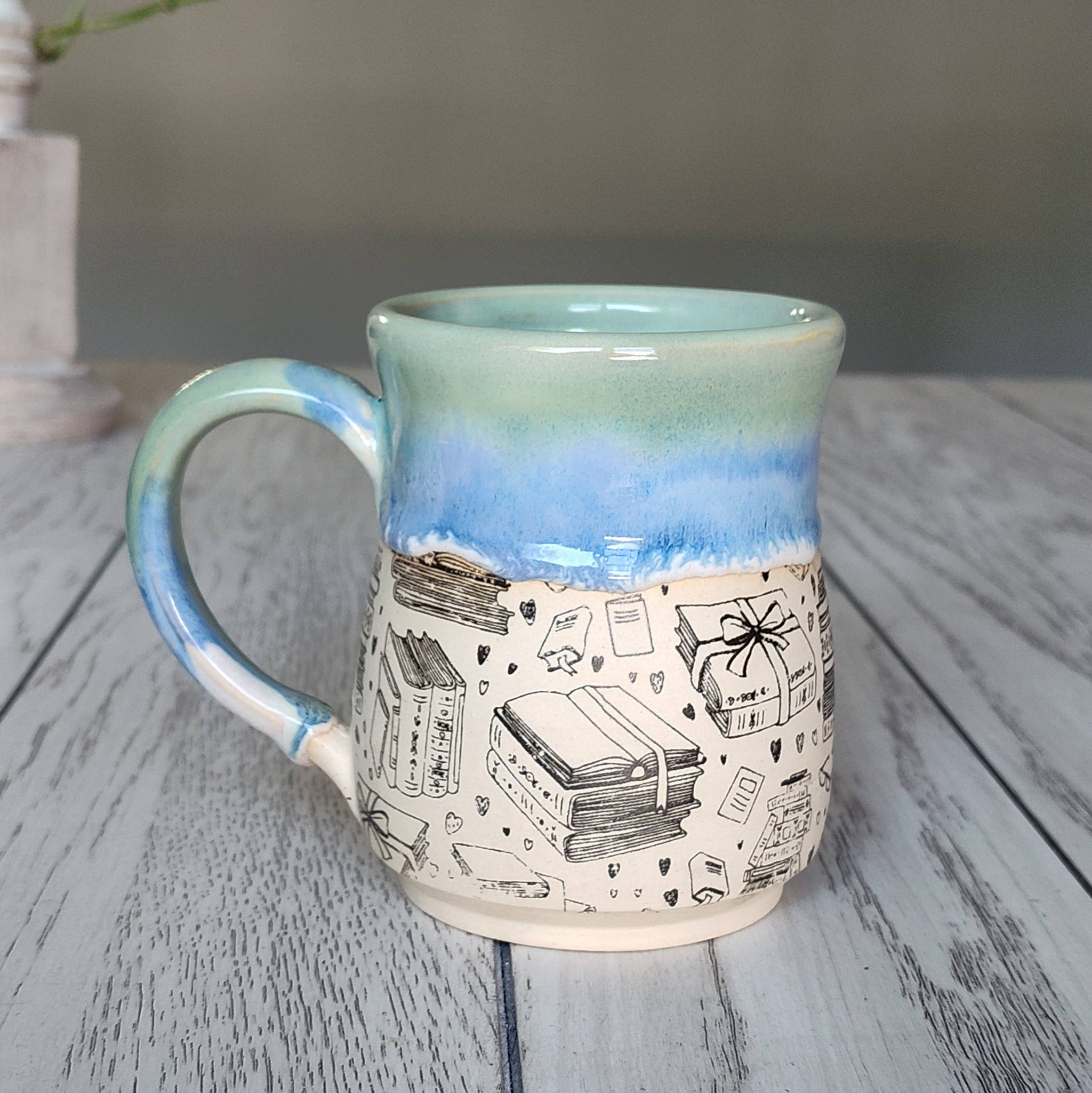 Calling all bookworms, caffeine-fueled writers, and devoted story lovers—this is the mug you've been waiting for! A perfectly sized companion for your reading nook, this 12–16oz ceramic mug celebrates the magic of books with charming book-themed illustrations that'll make every sip feel like a literary adventure. Crafted by hand with thoughtful attention to detail, this mug features a beautiful contrast of textures: a raw, unglazed clay bottom that feels authentically artisanal, paired with a glazed top in soothing blue, green, and cream tones. The smaller capacity makes it ideal for lighter morning pours or those moments when you want to savor your beverage slowly while lost in a good chapter. Perfect for smaller hands too, this mug proves that good things really do come in cozier packages. Dishwasher and microwave safe, it's as practical as it is charming—no fussy hand-washing required. Each handmade piece is unique, with natural variations in glaze and size that add to its one-of-a-kind appeal. Whether you're treating yourself or gifting to a fellow book enthusiast, this mug is perfect for bookstores, writing retreats, teacher appreciation gifts, and academic gift shops. It's the kind of everyday object that reminds you to slow down, brew a fresh cup, and get lost in a great story.