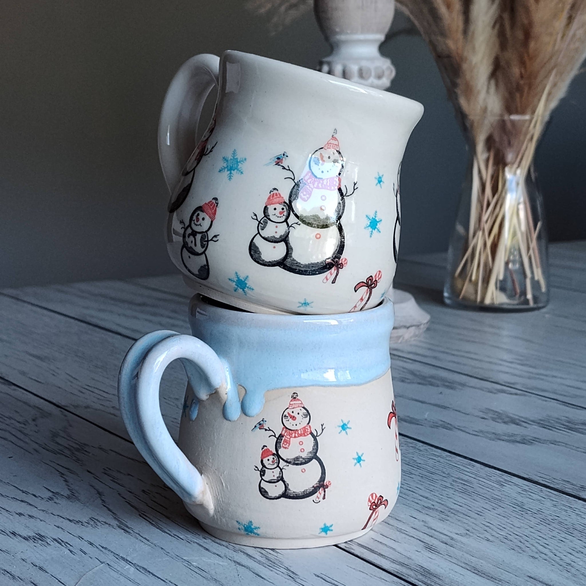 Wrap your hands around winter magic with this delightful handcrafted ceramic mug that brings snowmen, candy canes, and frosty vibes straight to your morning routine. Holding a cozy 12–14 oz, this playful piece features cheerful snow people dancing across the surface, surrounded by icy blue snowflakes that sparkle with seasonal charm. Designed for maximum coziness, the curved handle fits perfectly in your palm while the generous shape cradles your favorite warm beverages—hot cocoa, spiced cider, or steaming coffee all taste better in a mug this festive. Choose your perfect finish: a classic cream glaze for timeless elegance, or a light blue and cream combination that echoes the frosty theme. The raw clay lower half adds authentic artisanal character, creating a beautiful textural contrast with the glossy glazed upper portion. Every mug is lovingly handmade, dried, fired, and glazed with individual care, making each one beautifully unique. Microwave and dishwasher safe, it's as practical as it is charming—no special treatment needed. Natural variations in size and glaze are part of the handmade appeal, adding to the authentic character of your piece. Perfect for holiday boutiques, winter markets, ski lodge gift shops, and retailers celebrating handcrafted ceramics. Whether you're stocking shelves or treating yourself, this snowman mug brings instant joy to any kitchen.