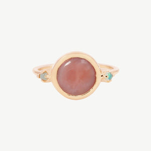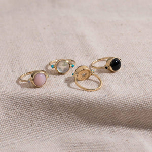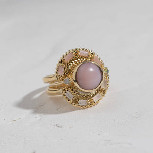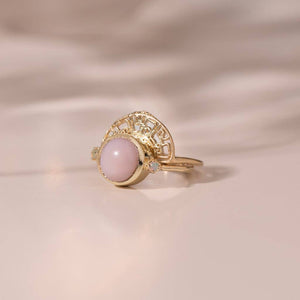 Embrace a little mystery and magic with this charming treasure! The unique celestial vibe of the Hidden Star Ring, features a mesmerizing 9mm pink opal that shimmers with every move, nestled beside a sparkling 2mm faceted opals. This playful duo is crafted from gold-plated bronze, which combines durability with a warm glow.  Perfect for everyday wear or special occasions like a secret star waiting just for you.