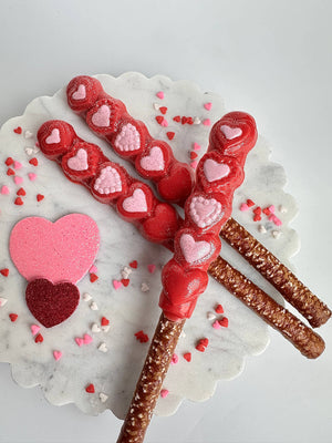 Spread the love with these charming Valentine pretzel rods! Crispy pretzels are dipped in rich red chocolate and shaped into adorable hearts with pink accents, then dusted with edible glitter for a magical sparkle. Each rod is individually wrapped and tied with a coordinating ribbon, making them gift-ready straight out of the box. Sweet, salty, and absolutely stunning—perfect for sharing with someone special. 💖