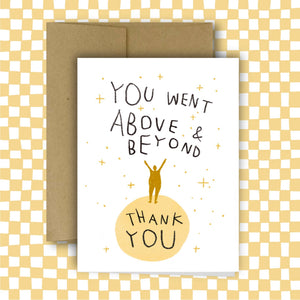 Show your appreciation with this uplifting "You Went Above And Beyond" greeting card—the perfect way to recognize someone's exceptional effort and dedication. Whether celebrating a colleague's outstanding work, a friend's generous help, or a loved one's incredible support, this card delivers genuine gratitude with style. The blank interior gives you space to share exactly why they deserve the praise. Printed on luxurious matte 100LB vellum cardstock (4 1/4" x 5 1/2"), the card feels premium and substantial. It arrives with a beautifully textured 30% recycled kraft envelope (4 3/8" x 5 3/4"), making it ready to mail or hand-deliver. Proudly made and printed in the USA using our artisanal, small batch production method, each card is crafted with genuine care. Because of our hands-on approach, slight color variations may occur from card to card, adding to the authentic, handmade character of your message. A meaningful way to say thank you!
