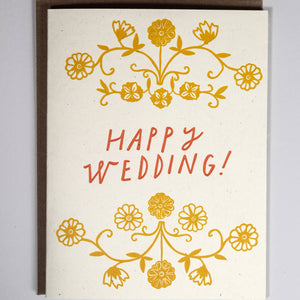 Two hearts, one perfect card! This joyful Happy Wedding Card brings playful charm to one of life's greatest celebrations. Each card is lovingly handprinted using traditional letterpress methods on premium American-made paper, crafted one color at a time in a charming two-person studio nestled just outside Asheville, North Carolina. Sized at A2 and paired with a coordinating Kraft envelope, this card arrives nestled in a compostable plastic sleeve (feel free to request otherwise). Created on authentic vintage letterpress equipment with a dedication to eco-friendly practices, every impression tells a story of intentional, sustainable craftsmanship that honors the special moment you're celebrating. The blank interior is your canvas—write your warmest wishes, inside jokes, or heartfelt advice for the newlyweds. Because the best wedding cards are the ones made by hand, with care, by people who believe in doing things the right way. We're a teeny-tiny operation, but we pour our hearts into every single order. Here's to love, to handmade magic, and to supporting makers who get it!