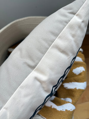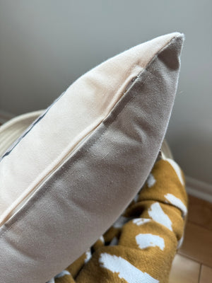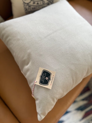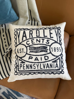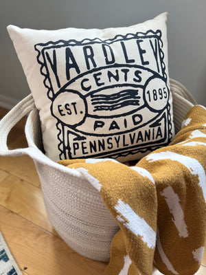 This Yardley pillow design has our "stamp" of approval! Custom created just for Krysset, this vintage postage stamp inspired design is handmade with an organic linen-cotton blend and filled with recycled fiber fill. Perfect for showing off your town spirit, this mini pillow makes a cool retro accent for your home. Approximately 16"x16" - off white cotton-linen front with Yardley postage stamp print and neutral gray cotton-linen on the back (no printing on reverse side).