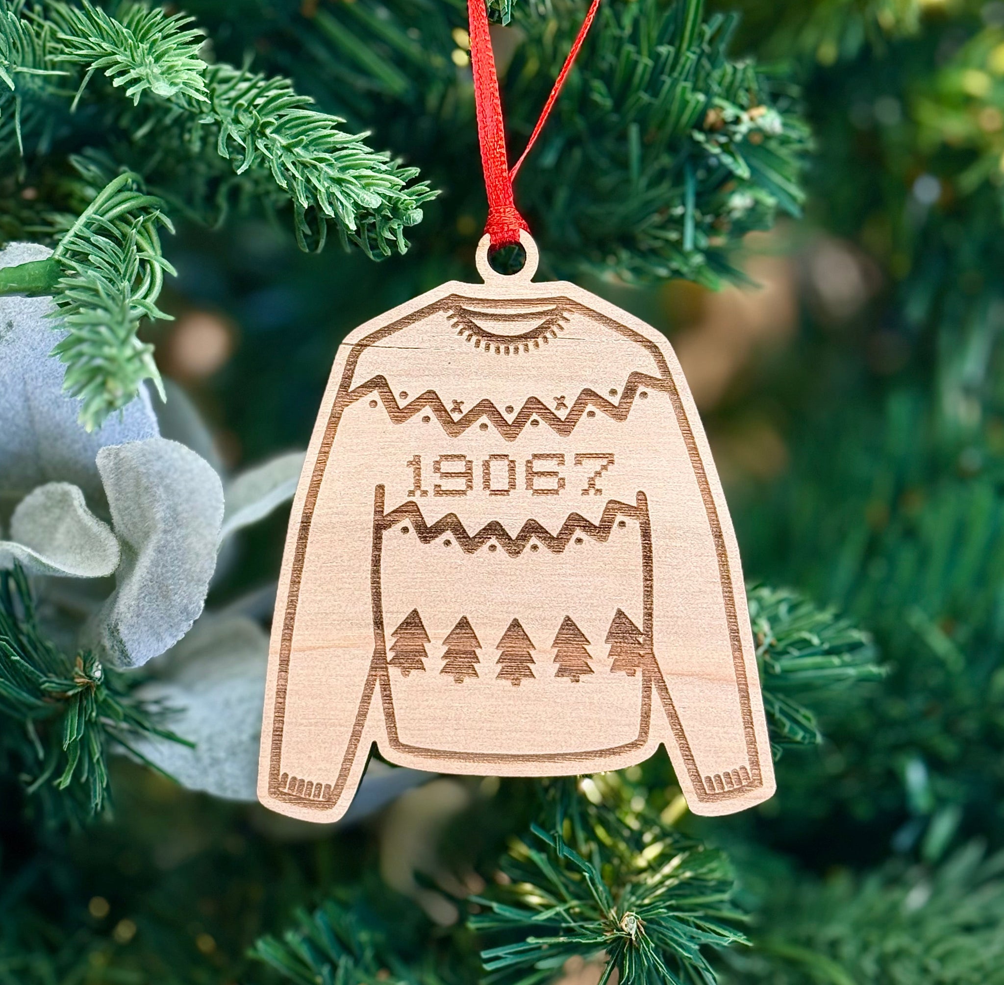 Adorn your gifts and tree with this charming 19067 zip code Christmas sweater ornament! Handcrafted from birch wood and tied with a delicate red satin ribbon, it's a perfect Yardley reminder for friends, family and co-workers near & far! Use it as a present topper, or hang it on a wine bottle. Show off your town spirit and embrace local vibes this season!