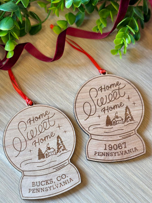 19067 is our Home Sweet Home this year and always in our hearts <3 This adorable winter wonderland snow globe 19067 ornament, is tied up with a pretty red satin ribbon for a festive pop of color. Perfect for sprucing up gifts, wine bottles, or your tree, it's a special seasonal reminder of your local pride. Share the love with friends, family, clients and colleagues near and far!
