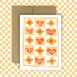 Spread a message of kindness and self-compassion with this gentle "Be Gentle" greeting card. Whether you're encouraging someone through a tough moment, celebrating their journey toward self-care, or simply reminding them to be kind to themselves, this card delivers a tender, uplifting sentiment with a playful touch. Each card arrives protected in a cello sleeve, making it gift-ready right out of the box. The blank interior is your canvas for adding a personal note that resonates with the recipient. Printed on luxurious matte 100LB vellum cardstock (4 1/4" x 5 1/2"), the card feels wonderfully substantial and elegant. The coordinating 30% recycled kraft envelope (4 3/8" x 5 3/4") adds an eco-friendly element to your thoughtful gesture. Proudly made and printed in the USA using our dedicated small batch production process, every card is created with intention and care. Due to our hands-on approach, you may notice charming color variations from card to card—a beautiful reminder of the artisanal quality behind each piece. A meaningful way to remind someone that gentleness matters.