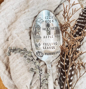 Embrace the cozy vibes of the season with the Fall Aesthetic Spoon, a delightful piece from our Holiday Spoons collection! Hand stamped on carefully selected vintage flatware, this spoon combines charming rustic appeal with practical use, perfect for stirring your warm drinks or adding a seasonal touch to your kitchen. All Sweet Thyme products are food safe and crafted to be enjoyed every day, bringing a little autumn magic to your morning coffee or tea. Whether you’re celebrating fall or just love the cozy aesthetic, this playful spoon brightens your routine with vintage charm and heartfelt craftsmanship.
