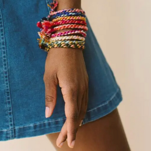 Hand Spun Rope Bracelets are in this season in a range of punchy combinations! The rope is hand spun from colorful cotton threads to create this soft and comfortable adjustable bracelet. Wear them individually or stack them up playfully in a nod to vintage friendship bracelets.