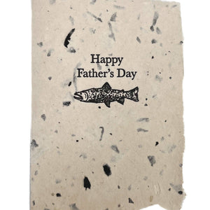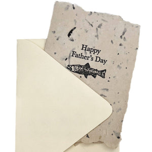 Make a splash this Father's Day with our playful fish card—hand-pressed onto gorgeous tea leaf paper in our California studio. Each card features a charming fish illustration and heartfelt "Happy Father's Day" message, complete with that satisfying textured deboss from our antique letterpresses. Every card is truly one-of-a-kind, thanks to our botanically-based dyes that shift subtly with nature's whims. Think of it as your card's personality shining through! Includes a cream A2 envelope and a bonus mini card sharing the behind-the-scenes magic of how we make it all happen. Pro tip: Keep it away from direct sunlight to preserve those beautiful, earthy tones.