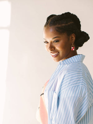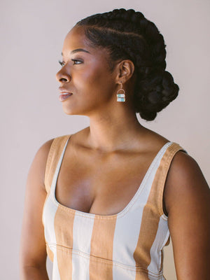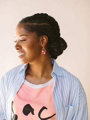 The In Stitches Earrings are a fresh, updated take on our classic Colorblock Earrings, celebrating form and texture in a double dose. Here, two bars are wrapped in soft cotton thread to create a vibrant, colorblocked design before being suspended from a glimmering half-circle of gold fill wire. The smooth metal contrasts beautifully with the soft, tactile feel of the cotton and the result is a sophisticated look with just the right amount of edge. Perfectly proportioned and lightweight, the In Stitches Earrings are a versatile addition to any wardrobe.