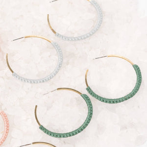 These bold but lightweight hoop earrings feature intricate hand-tied macramé knots in gorgeous shades of sky blue, blush pink, and meadow green over satin finished brass. They're add subtle statement with an artful touch to your everyday look; perfect for both the macramé lover and classic hoop silhouette enthusiast. Effortlessly modern and elegance, they can be dressed up or down to match your daily wardrobe making them an essential addition to your handcrafted jewelry collection!