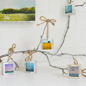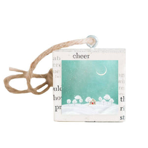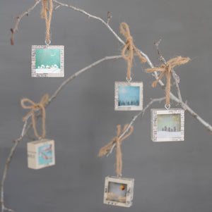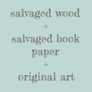 Exquisitely handcrafted with an archival print of Michelle’s original artwork, salvaged wood, and salvaged library book paper and hand-sealed to preserve the ornament for life; no two are alike! The salvaged book paper on your ornament makes each one a true original and comes with a twine ribbon so it’s ready to hang on your tree!