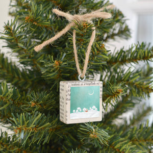 A snowy scene of a magical winter night. A whimsical, beautifully handcrafted holiday tree ornament that's unique in every way. From the artwork itself (all created by artist Michelle) to the sustainable materials, each one magical delight. Plus they're pet and kid-friendly; no need to be afraid of wagging dog's tails or curious little hands around these ornaments!