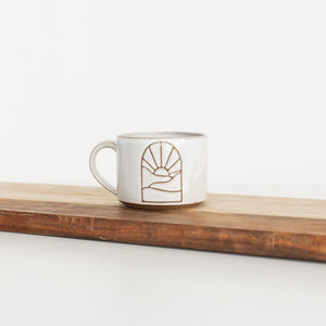 Brighten your morning routine and start your day with a touch of warmth and style with the Sunrise Portal Mug. This beautifully crafted mug features a classic white glaze, showcasing an exposed nutty brown clay design that mimics a stunning sunrise. The design is thoughtfully placed on both sides of the mug, making it a perfect choice for left or right handed users. Comfortably holding 16 ounces, this mug is ideal for your favorite coffee, tea, or hot chocolate, ensuring you enjoy every sip.