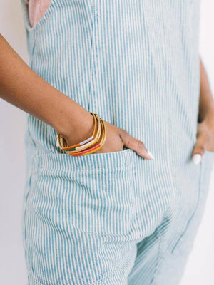 Our Wrapped Square Bangles are perfect for layering and add a mod touch of color to any look. Mix and match multiple shades and metals for an easy artful addition to your outfit! DETAILS Measures 2 ½" x 2 ½" and fits most wrists o Materials: sterling silver plated or 24k gold plated CARE We love these bangles because they are so low maintenance and keep their shine.